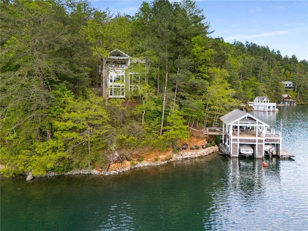 Absolutely breathtaking big water, sunset mountain views from this Lake Burton waterfront architect's home. Located down a meandering gravel road, 1006 Perrin Cove is a private, contemporary lake camp-style property where relaxed elegance invites you to sit back and enjoy the views. Approach the property from the main Lake Burton channel to the South end of the lake. The 2-stall, 2-story boathouse offers ample space for a large wakeboard boat, pontoon boat, electric wooden boat and two jet ski lifts with matching Sea-doo jet skis all negotiable with the sale of the property. Upstairs, enjoy idyllic sunset views from the covered upper deck. A gangway leads to meandering landscaped grounds up to the stately Cape Cod-style home. Step inside to the main living space with a combined kitchen, living room offering beamed maple ceilings and a contemporary style. Off of the kitchen, find a spacious screened porch that’s a wonderful place to relax and enjoy the lake views. Downstairs, find a primary bedroom suite and guest suite both offering views of the lake. Upstairs, in the main portion of the house, find another guest bedroom suite along with multiple outdoor living spaces one complete with an outdoor masonry fireplace and wet bar. Connecting the main portion of the house with the original lake cottage is a recreational room breezeway with four garage doors. In the original cottage, find an additional living room, kitchenette, laundry room, 4 bedrooms, a bunk room and two shared bathrooms. Bring your creative vision to renovate the kitchen and bathrooms or enjoy the living space just like it is. Located towards the end of Perrin Cove Rd with one of the best views of the 4th of July Fireworks on the lake! Shown by Appointment Only. Please, no drive by's.