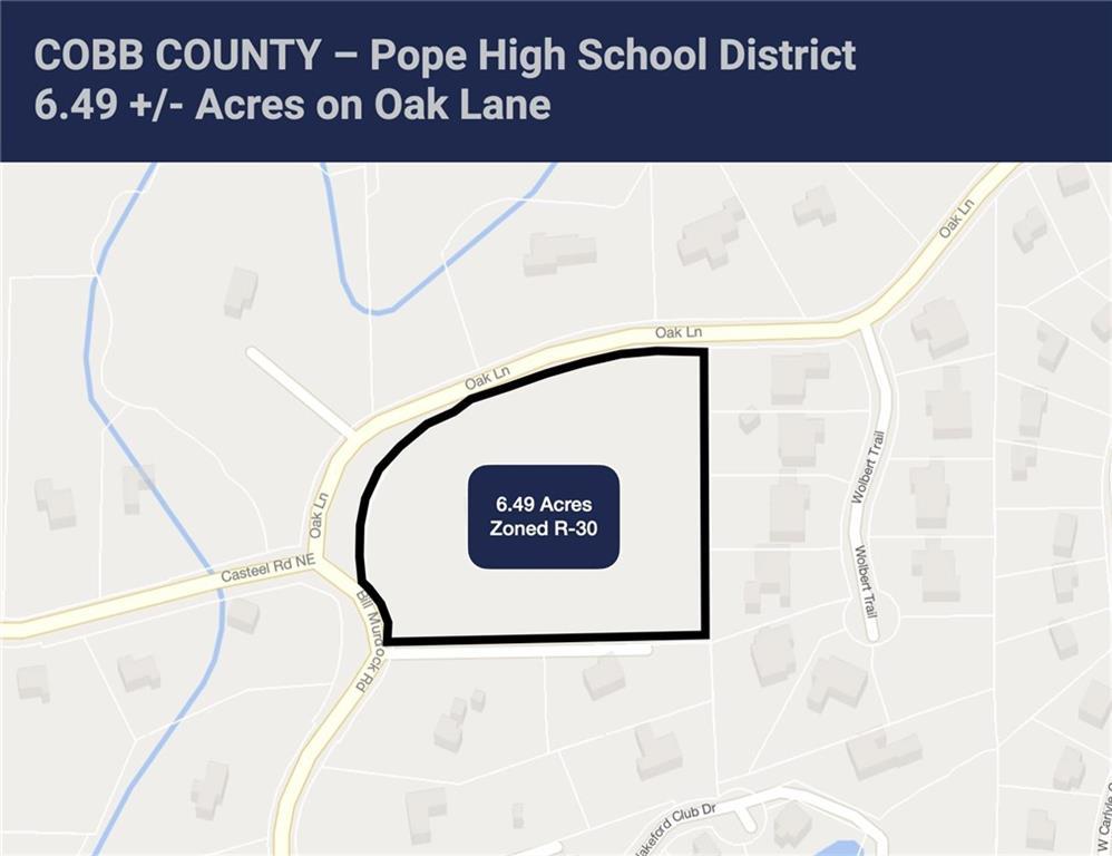 This prime property is now available in the highly sought-after Pope High School District. This parcel offers great potential for a custom or semi-custom home builder who is ready to take advantage of the limited supply of new home inventory in this district. The 6.49 acre property is located at 3650 Oak Lane, Marietta, GA 30062. The parcel is zoned R-30 in Cobb County, for 30,000 sq ft lots allowing a density of approximately 1.2 units/acre for about 8 lots. There is a sewer line and water line available to serve the property. See Marketing package for maps of these lines. The property has frontage along Oak Lane and Bill Murdock Road. The Schools are as follows: Tritt Elementary School (Great Schools Rating 9), Hightower Trail Middle School (Great Schools Rating 9), and Pope High School (Great Schools Rating 10). Asking Price: $2,400,000