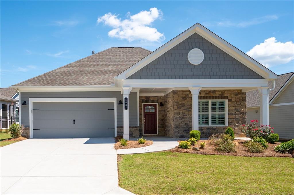 Step free ranch home in small active premier West Cobb 55+ community. This Traton built home boast of elegant architectural details including high ceilings, transom windows allowing outdoor light, and many upgrades. The open great room includes fireplace with built-in storage cabinets on either side. The gourmet kitchen features oversized island/breakfast bar, stainless hood vent, pull out cabinet shelving and pantry. A flex room with French doors and transom window allows for optional usage. The master suite includes sitting area with excess to patio, tray ceiling, custom shutters and crown molding. En-suite bath features large dual vanity with ample storage, oversized walk-in shower, separate water closet, and linen closet. Home has a separate storage room and laundry room with storage area. Large covered patio with two entryways faces private yard. Community amenities include resort style clubhouse, covered outdoor space, fitness center, relaxation pool and dedicated enclosed dog park. Community offers low maintenance lifestyle.