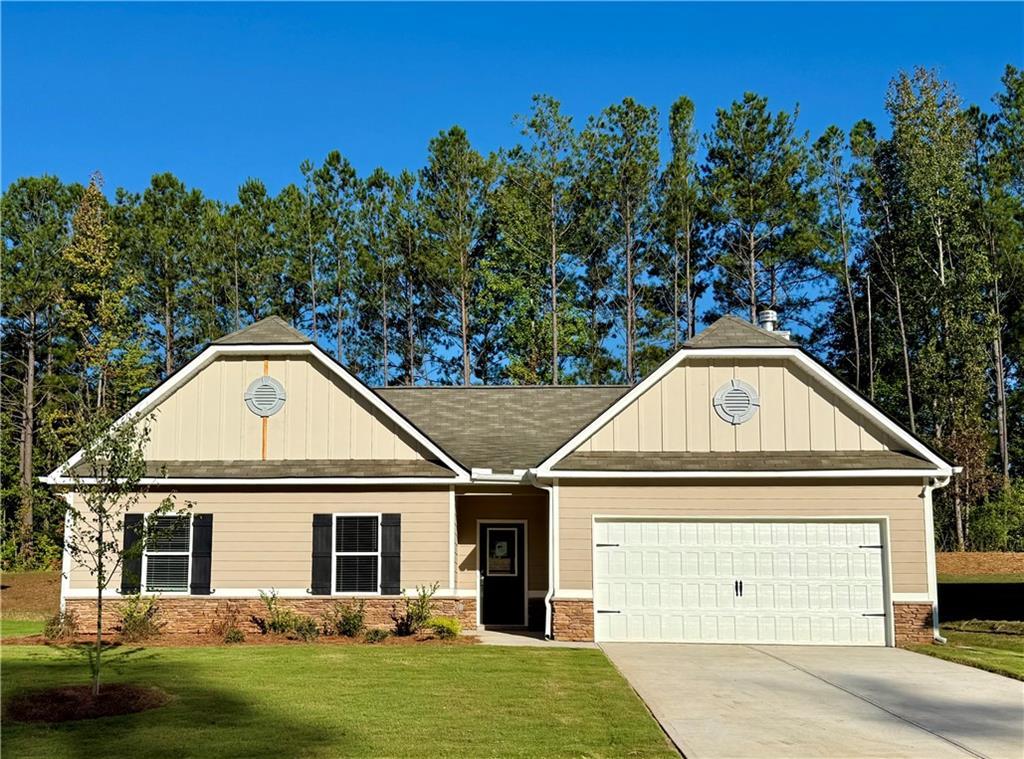 Home is move in ready and USDA Eligible! Lot 107 - Plan 4944 F / Ranch floorpan that features a Craftsman style exterior with a combination front elevation of stone, Hardiplank with board & batten. This plan includes 3 bedrooms and 2 baths with a 2 car garage, smooth ceilings throughout, and 9' first-floor ceilings. The main floor features a spacious family room with fireplace, dining area, and large kitchen with granite countertops, island, and stainless appliances, as well as the spacious primary suite with dual vanity, garden tub, separate shower, and large walk-in closet. Two additional large bedrooms are also located on the main floor. Builder will contribute $10,000 toward closing costs. Blinds, Screens, Glass Shower Door in Owner's Suite and Garage Door Opener added at no charge to Buyer!