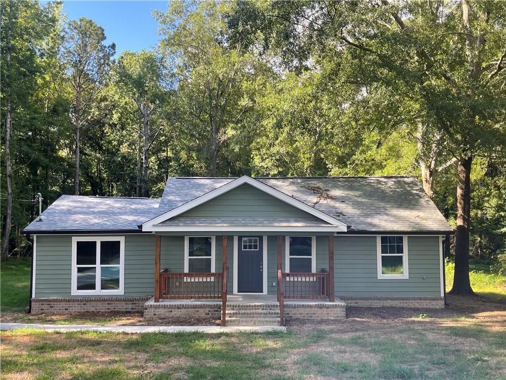 Welcome to this charming 3-bedroom, 2-bathroom home situated on a spacious 1+ acre lot. Featuring an open-concept floor plan, this home offers a seamless flow between the family room, kitchen, and dining areas—all finished with durable and stylish LVP flooring. The chef’s kitchen is the heart of the home, boasting white cabinetry, quartz countertops, a large island perfect for gathering, and a suite of stainless steel and black appliances. Recessed lighting throughout adds a modern touch and brightens every space. The expansive primary suite features vaulted ceilings, double windows that flood the room with natural light, and a generous walk-in closet. The spa-like primary bathroom includes a tiled walk-in shower, granite countertops, and more LVP flooring for easy maintenance. Two secondary bedrooms offer plenty of space and closet storage, ideal for family, guests, or a home office. Enjoy relaxing on the classic rocking chair front porch or entertaining on the large back deck. Conveniently located just minutes from I-20 and local shopping. Don’t miss your opportunity to own this beautiful new home with plenty of outdoor space!