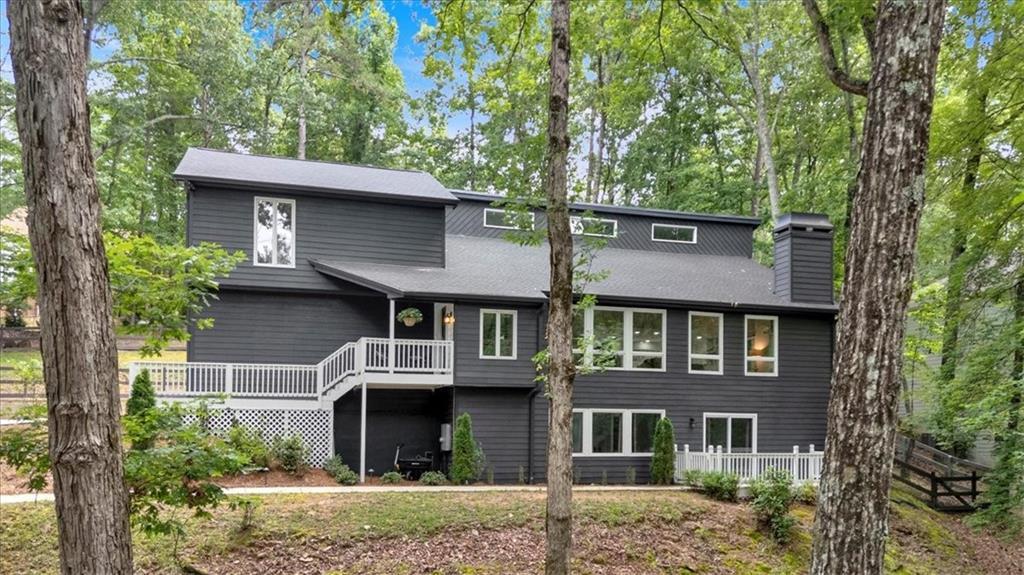 Nature lovers - you have found the one! Set on a rare 1.14-acre creekfront lot in Martin's Landing, this updated home offers peaceful surroundings with mature trees and nature's playground right outside of your doorstep. Large windows throughout bring in natural light and views of the property, seamlessly connecting indoor and outdoor living. The main level features an open floor plan with oak hardwood floors, a floor-to-ceiling marble fireplace, and a spacious kitchen with quartz countertops, stainless steel appliances, and an oversized island. Upstairs, the primary suite offers vaulted ceilings, a walk-in closet, a flex room that can be used as a second closet or office, and a luxurious bath with a freestanding tub and rain shower. Two additional, large bedrooms complete the upstairs with vaulted ceilings and access to a shared bathroom. The finished terrace level includes a light-filled living area with second marble fireplace, a full bedroom and bath, and a versatile flex space—ideal for a gym, office, or media room. A private porch provides separate access, making it perfect for guests or rental potential. Outdoors, enjoy two firepits, two retractable awnings, a large back deck, and the peaceful creek. The home also offers ample parking with an extended driveway, parking pad, and garage with 3 EV charging stations. Inside the garage, there’s additional storage and a kayak/paddleboard pulley system. The home also has a newer roof, water heater, furnace, and rain gutters. Energy efficient windows. As a resident of Martin’s Landing, you'll have access to 3 Pools, 13 Tennis courts (including Two Clay courts), 6 Pickleball courts, the Martin's Landing Dolphins swim team, community wide events, miles of walking trails, a private lake for fishing and kayaking, and direct access to the Chattahoochee River—outdoor living at its best, right in your own backyard.