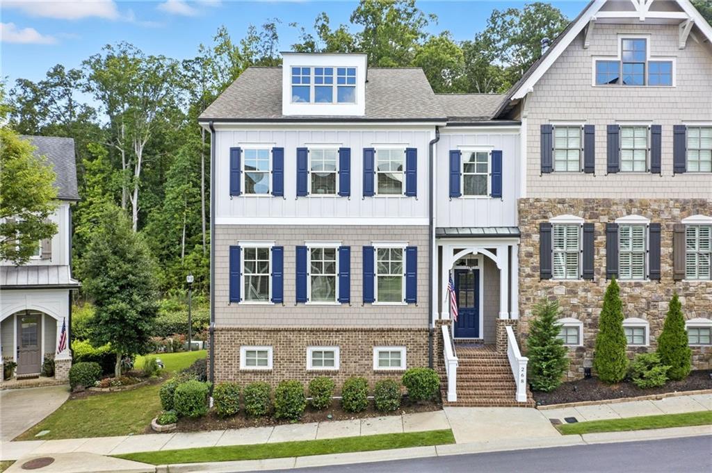 Stunning Executive end-unit Townhome in Overlook at Sixes offering a turnkey lifestyle with an elevator to all three levels and serene green space views from the screened porch. The exterior blends brick, board and batten, and shake, leading to a welcoming foyer and open floor plan with hardwood floors, crown molding, and custom trim. The Great Room features a coffered ceiling, stone fireplace, and built-ins, flowing into the dining room with shiplap accents. The gourmet kitchen boasts white cabinetry, stone countertops, farm sink, oversized island, stainless appliances, gas cooktop, Rev-A-Shelf pull-outs, and a walk-in pantry/dry room. Kitchen also has large keeping room with fireplace. Upstairs, the primary suite offers two custom walk-in closets and a spa-like bath, plus two secondary bedrooms and a loft. The finished terrace level includes wainscoting, a Murphy bed, and abundant storage. Notable upgrades include faux brick accents, wooden registers, wainscoting in baths, epoxy garage floor with fans, insulated oversized garage doors, custom outdoor lighting, Ring doorbell, Schlage keypad, Nest thermostats (4-zone with humidifier), laundry room with cabinets, sink, and in-wall ironing board, new exterior paint, roof wash, and newer AC coil with all systems serviced. Community amenities include a clubhouse, fitness center, and pool, with optional BridgeMill Athletic Club membership for golf, tennis, pickleball, and more. Minutes to Lake Allatoona, shopping, and dining.