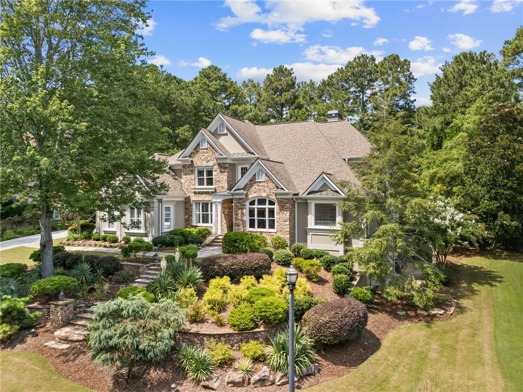 Nestled within an exclusive gated community, this executive residence offers a primary suite on the main level with a walk-out main level flat back yard. Perfectly positioned along the 11th fairway of the Golf Club of Georgia, this hard coat stucco and stone home boasts a private, fenced, flat backyard with lush lawn, soothing water features, and a covered patio designed for year-round enjoyment. Inside, the primary suite on the main level provides a serene retreat with walkout access to the backyard oasis. The heart of the home is an eat-in kitchen with views to both the dramatic two-story great room and the inviting keeping room, creating a seamless flow for daily living. Entertain with ease in the formal dining room, complete with a butler’s pantry and wet bar or retreat to the richly appointed library/office for quite productivity. The second level is thoughtfully designed with three spacious bedrooms, each featuring its own en-suite bath. A study nook or secondary office space offers flexibility for focused work or study time. The terrace level extends the lifestyle experience with multiple recreation and entertaining spaces, a private guest suite with dedicated bath, a fitness area, and generous storage. Located within Alpharetta’s Windward community, don’t miss all the amazing amenities that Windward offers such as lake recreation, play grounds, dog park, community garden and so much more. Enjoy top rated north Fulton schools and ease of access to GA400, downtown Alpharetta and Avalon. Blending sophistication and comfort, the home is as functional as it is elegant-ideal for both grand entertaining and intimate family living.