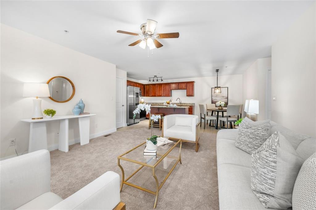 Welcome home to this ground floor, 2 bedroom, 2 bathroom condo in the heart of Smyrna. With fresh paint and carpet throughout and updated kitchen and baths, this home is fully move-in ready. The living space is open-concept with views to the dining area and kitchen. The kitchen is both functional and inviting, offering granite countertops, an island with barstool seating, a pantry, and all stainless steel appliances included. Off of the living room is a spacious covered balcony — perfect for morning coffee or evening relaxation. The oversized primary suite features ample natural light, a walk-in closet, and a spa-like bath featuring a large vanity, soaking tub, and separate, frameless, tiled shower. Both bathrooms are finished with tile surround tubs and flooring and granite countertops. A full laundry room in the hallway can accommodate side-by-side washer and dryer for added convenience. Don't miss the community amenities including a pool, fitness center, and clubhouse. Located just a short walk from parks, playground and the restaurants and shops of Smyrna Market Village. Minutes from Truist Park, The Battery, and quick access to I-285 & I-75, this condo is perfectly positioned for both work and play. VA Loan Assumption possible.