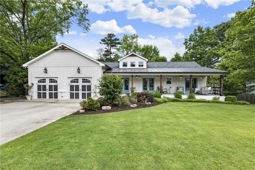 Fully renovated Ranch on a Basement in the Heart of Downtown Alpharetta. This is not your typical renovation-this designer home underwent a full rebuild, complete with a dramatic vaulted addition and two-level west wing expansion, transforming it into a one-of-a-kind modern farmhouse with timeless character and luxury finishes throughout. Perfectly situated on a flat, fenced lot in one of Alpharetta's most coveted walkable neighborhoods, the home welcomes you with a bed swing front porch, stained tongue-and-groove ceiling, and dual ceiling fans-an idyllic spot for lazy summer evenings. The charm continues inside with three sets of French doors, a striking vaulted shiplap ceiling, and wide-plank hardwood floors bathed in natural light from high transom windows. The open-concept main level is anchored by a chef's kitchen featuring: A large quartz island with seating, Stainless steel appliances, including a 6-burner slide-in gas range, Custom vent hood, microwave drawer, French door refrigerator, and dishwasher, Porcelain apron sink, glass-front cabinets, floating shelves, and large pantry. The open dining space accommodates both formal and casual gatherings with ease, flowing seamlessly into a spacious family room with multiple layout options. Down the hall, the laundry/mudroom is as functional as it is stylish, boasting a custom dog wash station, folding counter, hanging space, and future locker potential. Two secondary bedrooms share a beautifully appointed bath with a large walk-in shower. Privately tucked away at the other end of the home is the primary suite retreat, featuring: A gas fireplace and designer accent wall, A spa-inspired bath with soaking tub, dual vanities, oversized walk-in shower, and custom closet with vanity, Private access to the screened-in deck with fireplace, easily convertible to a 4-seasons room for year-round entertaining. The finished terrace level offers even more flexible space with a guest suite and full bath, a gym/office/media room, and a huge unfinished area ideal for storage or workshop. Step outside to your private oasis offering a Flat, fenced backyard with covered patio, hardscape fire pit, goldfish pond, and raised garden beds, Expansive grilling deck perfect for dining alfresco under the stars! Additional upgrades include dual HVAC systems, whole-house water filtration, front and back irrigation, and an oversized driveway with parking for 6+ vehicles in addition to the two-car garage. (Square Footage: Above grade 2111, below grade finished 855, unfinished storage 401) All this just minutes from Downtown Alpharetta's vibrant restaurants, shops, music venues, parks, trails, and weekly Farmers Market-accessible via a private neighborhood shortcut. Don't miss this rare opportunity to own a completely reimagined home in one of Alpharetta's most desirable locations.