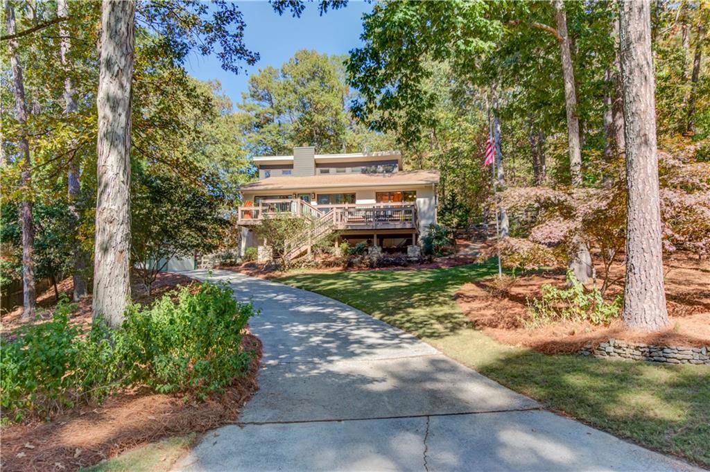 THIS HOME IS A MUST SEE! Enjoy peace, tranquility and beauty in this truly unique and amazing custom built mountain retreat home in the heart of Peachtree Corners! Sitting on .76 acres, located on a cul-de-sac and backing up to Simpsonwood Park with direct access, this home was custom built with emphasis of being a passive solar home (not to be confused with solar panels). The precise angle of the home takes advantage of the change of seasons for optimum sun entry and the home is extremely energy efficient, with high R-value insulation in the exterior walls and ceilings. GA Power rates it as one of the most energy efficient homes in the area! The open floor plan offers a ton of natural light from the abundance of doors and windows! You'll be thoroughly impressed by the soaring vaulted wood plank ceilings with exposed beams in the Family room and throughout the home. The beautiful stone fireplace is flanked by bookshelves. The landscaped and hardscaped yard is spectacular, featuring perennial and butterfly gardens, multiple gardening beds, and beautiful trees and plants throughout the property! The tiered front composite deck, accessible to the kitchen and the family room, offers fantastic elevated views of the trees and is a favorite place to eat dinner and entertain. The kitchen features beautiful custom wood cabinets with many specialized drawers and cabinets, quartz counter tops, a cool ceramic slate backsplash, a brand new dishwasher, a 5 burner gas range, and a bonus utility sink! Upstairs features the Owner's suite which is very spacious and features vaulted ceilings, custom built-in cabinets/closet and access to a private back deck. Across the hall is another bedroom/bonus room with vaulted ceilings. The upstairs also features natural cork flooring...with heating capability! Down one level from the main floor are 2 additional spacious bedrooms and a full bath. The lowest level offers a bonus room perfect for an office, recreation room, theatre, homeschool classroom, craft room -- so many options! The curb appeal of this hardcoat stucco and cement siding home is stunning, especially at night! Plenty of storage in the quality built and architecturally matching storage shed! LOCATION is Amazing! Walk into the awesome 223-acre Simpsonwood Park from your backyard! The thriving City of Peachtree Corners features the newly designed Forum Shopping Center and the New Town Center with a HUGE fantastic playground and hosts summer movies & concerts on the Green! Also convenient to highly sought after public and private schools including Simpson Elementary, Paul Duke Stem High School, Wesleyan and Cornerstone. Don't miss this gem!