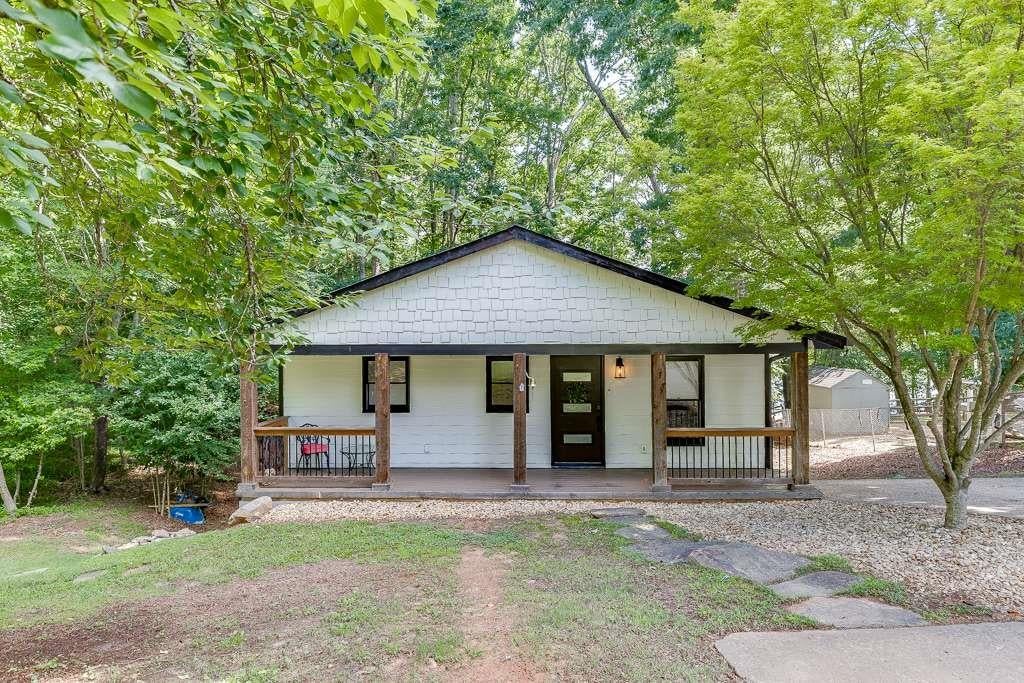 This adorable lakefront cottage offers peaceful year-round VIEWS of LAKE LANIER! While there is NOT A DOCK, bring your kayaks, SUPs, and fishing poles and enjoy an EASY WALK down to this quiet cove for a quick paddle over to Bald Ridge Marina and SmokeyQ BBQ. There is plenty of room to park several cars and boats/jet-skis on the level driveway with Mary Alice Park, Charleston Park, and Young Deer Park boat ramps just minutes away. Enjoy the beautiful front yard with a huge and healthy Japanese maple, canna lilies, and crape myrtle trees from the rocking chair front porch. Inside is a quaint open floor plan with panoramic water views. The PRIMARY BEDROOM is located on the MAIN LEVEL with hardwood floors that flow into the living room, dining area, and updated kitchen with ss appliances and a built-in wine fridge. The earth tone green kitchen cabinets provide ample storage space. Topped with white QUARTZ counters, the gold cabinet hardware and stylish kitchen sink faucet complement the natural exterior color palette. With natural light pouring in from the floor to ceiling picture windows, dining is not just an event, it's an experience. The lower level offers 2 more bedrooms that share an updated tiled hall bathroom, 2 hallway closets for extra STORAGE, and the utility-laundry room combo. A SUNROOM is attached off the back for more mosquito-free views of Lake Lanier sunrises. The crawlspace storage has electricity and is large enough for tools, mowers and lake toys. There is a leased propane tank on the side yard that services the dryer and the propane lines could easily be extended to the water heater and cooktop. While you will never want to leave, there is NO HOA or long-term rental restrictions; the Eagle Creek Shore Homeowners Association pool and clubhouse are walking distance and an optional membership is available for amenity privileges! Conveniently located just minutes from Cumming Marketplace, there is plenty of shopping, restaurants, hospitals, and easy access to SR 400/US 19. This is your opportunity to welcome priceless water views into your life at an affordable price. This property is also available for lease purchase or rental.